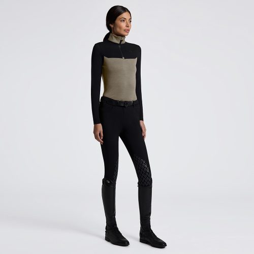 Polo técnico de entrenamiento verde y negro de manga larga con cuello alto y media cremallera para mujer -Cavalleria Toscana