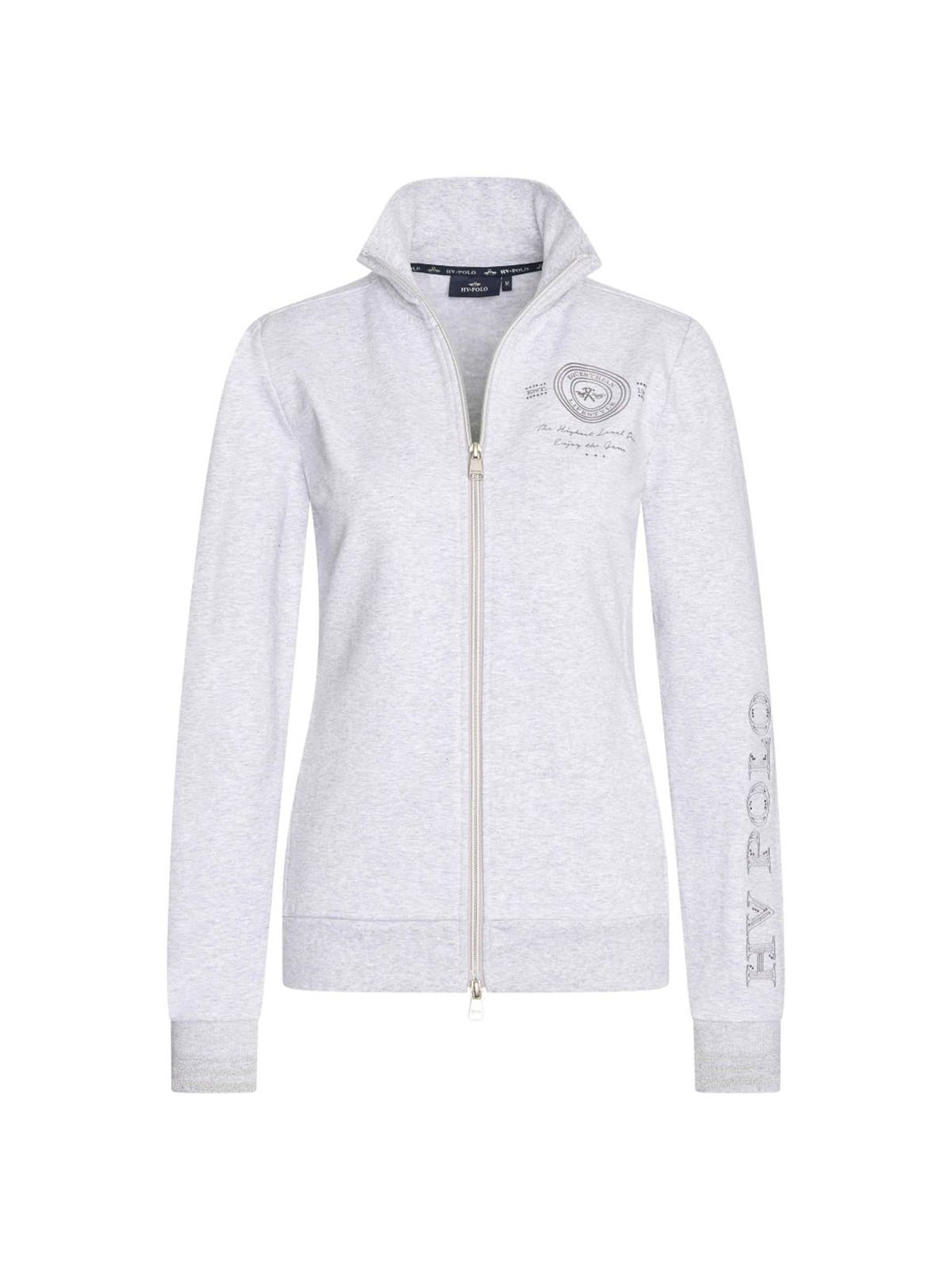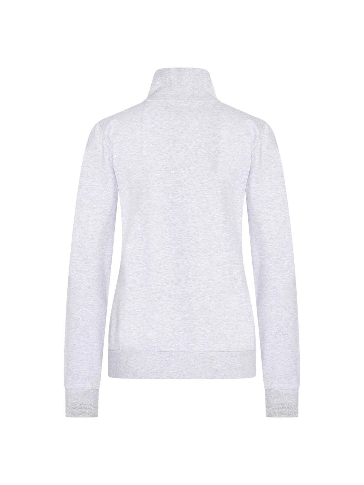 HVP Gina Cardigan, made from cotton terry fabric. Features a two-way zipper, ribbed waistband collar, ribbed cuffs with contrast trim, two side-seam pockets, chic rhinestone print on the chest, and rhinestone embroidery on the sleeve. Essential for daily activities, offering comfort without restrictions.