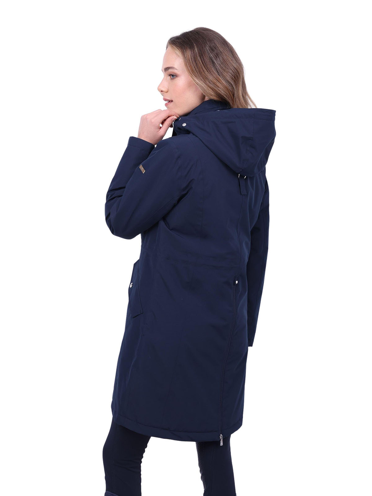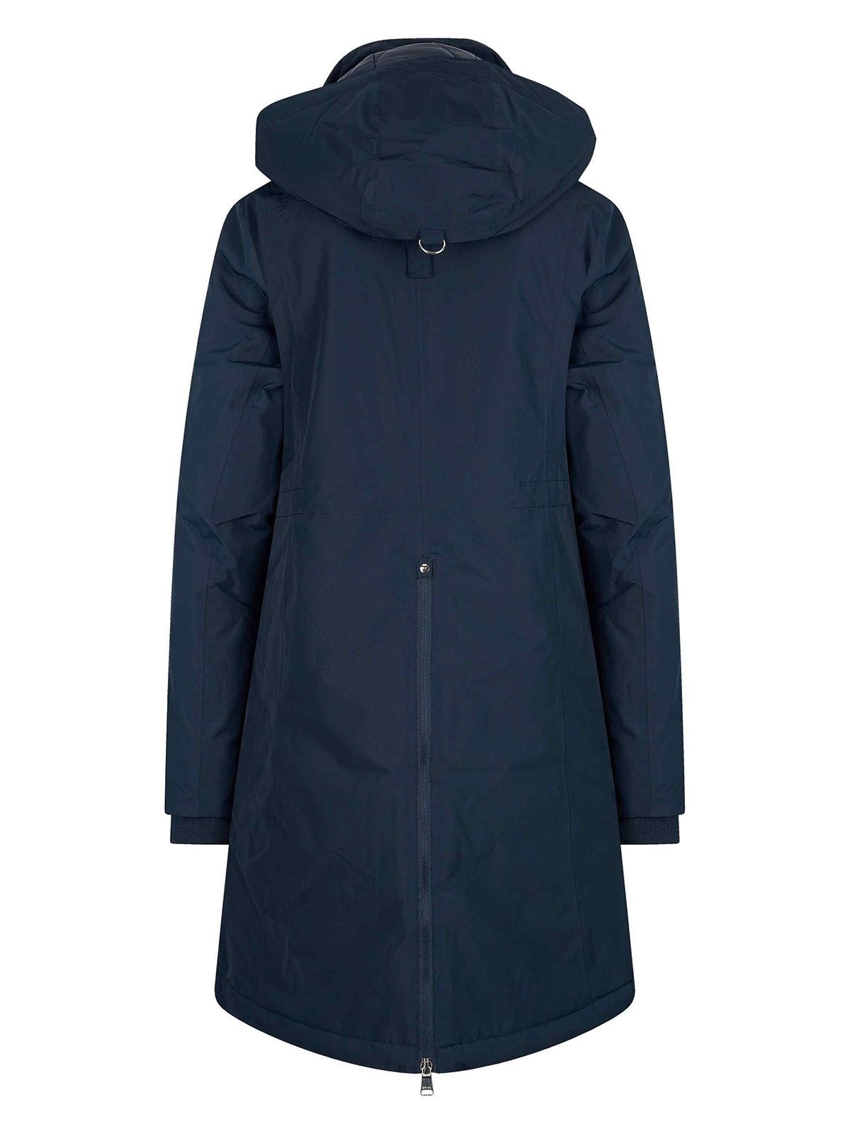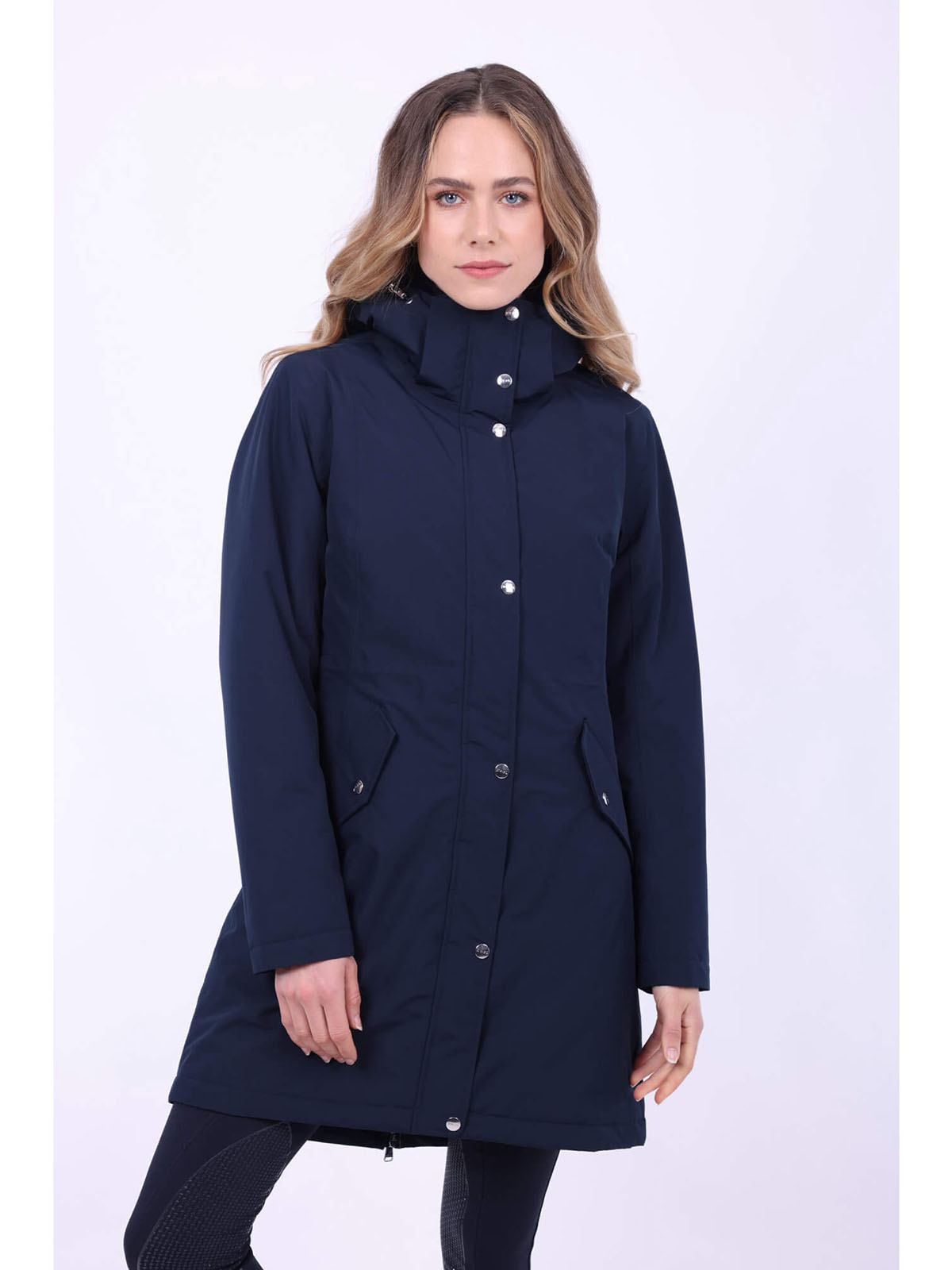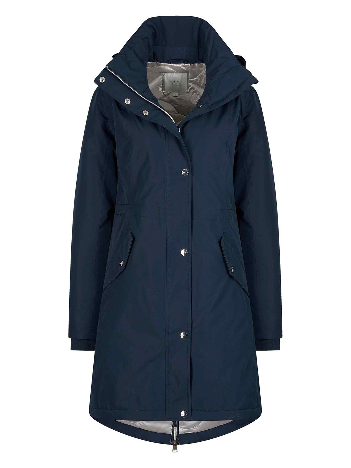 HVPNovia Parka Jacket, a sophisticated and warm parka design. This breathable and waterproof product features a two-way front zipper and quilted lining. The cuffs are fine rib with raised trim, and the waist is adjustable with an internal drawcord. It includes flap pockets with branded snap buttons and an interior zip pocket. The jacket has metallic lining with elegant quilting. Features a hood with elegant quilting and a strap to secure it. There is also a center-back zipper with HV rivet and an HV Polo label inside the placket.