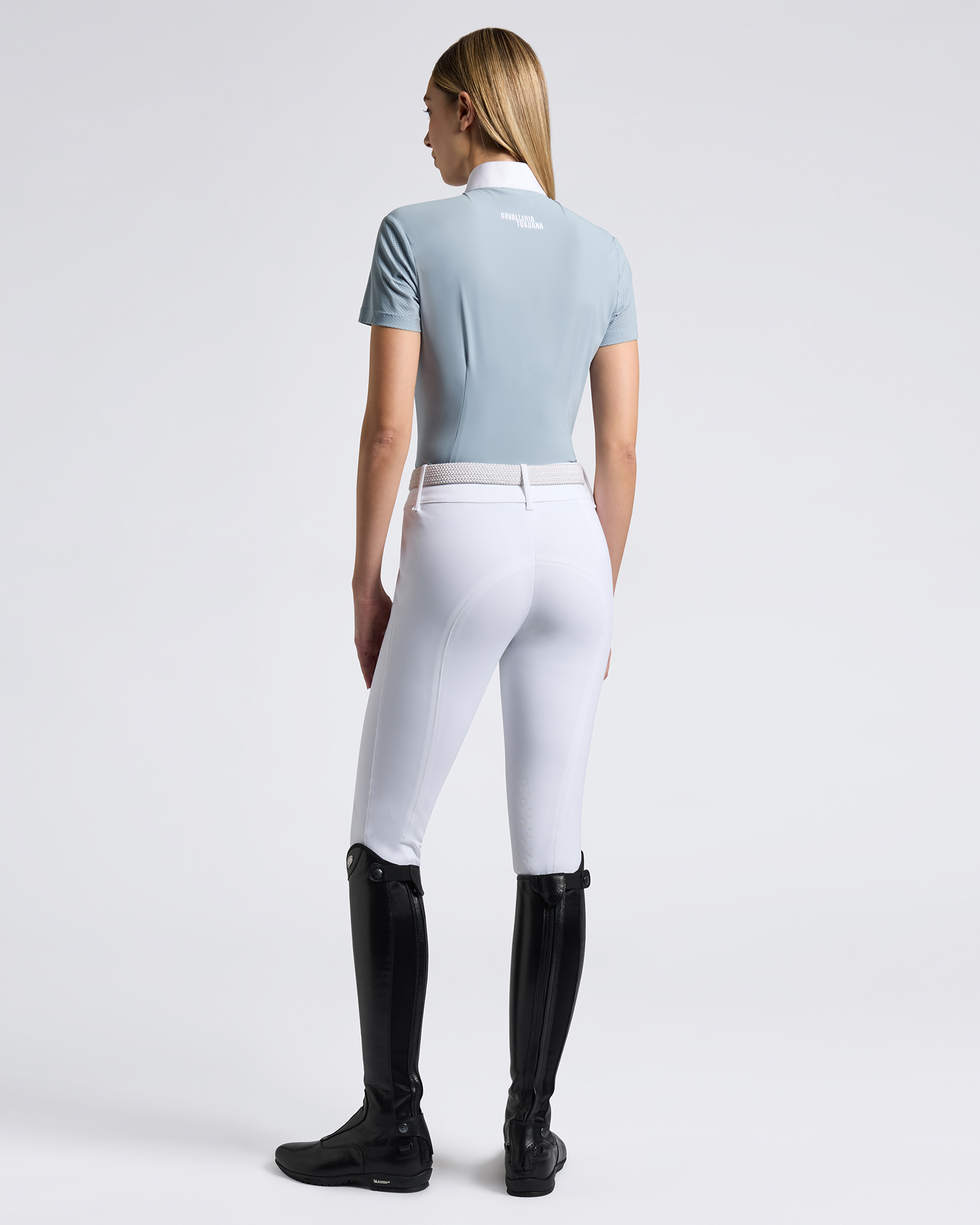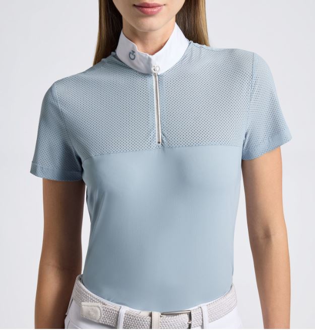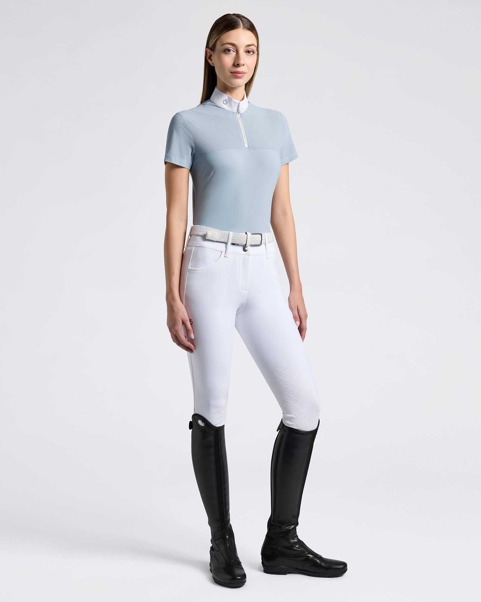 Light blue short-sleeve competition shirt with perforated jersey inserts and zipper for women – Cavalleria Toscana