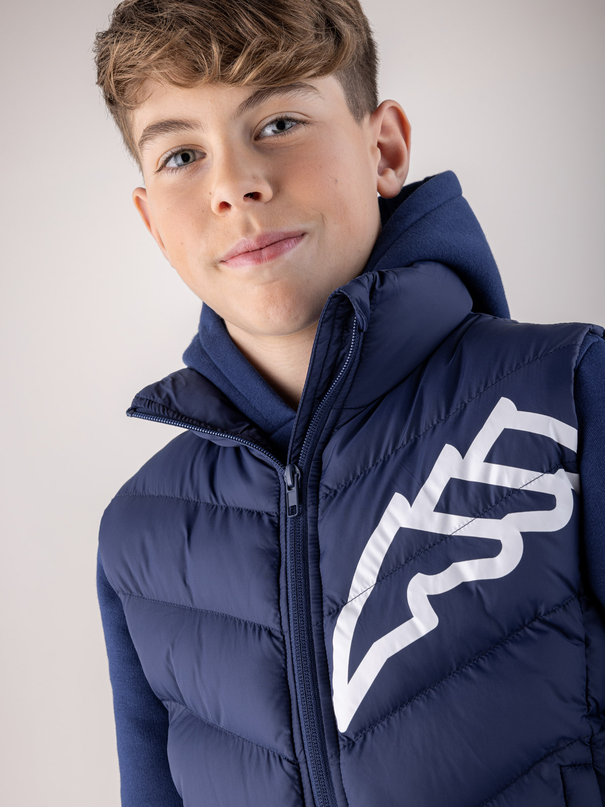 Chaqueta acolchada de plumón con capucha en azul marino con el logotipo en blanco para junior Cino – Equiline