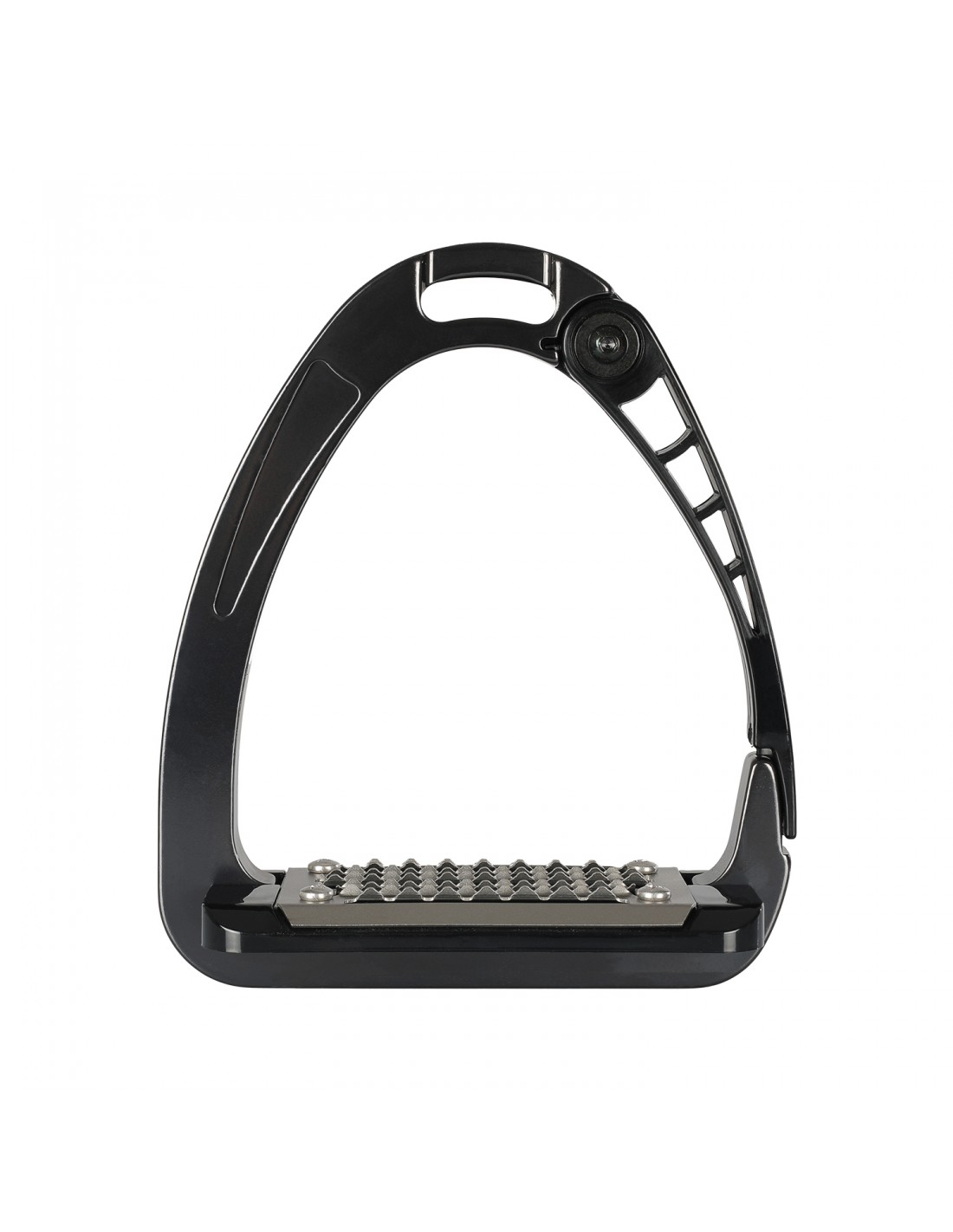 Fabricado con una aleación de metal y polímero de una sola pieza y sin soldaduras, materiales únicos combinados con una técnica de inyección modular que proporciona flexibilidad al estribo y una resistencia a la rotura sin igual. El taco del estribo está hecho también de poliamida con placa de aluminio dentado antideslizante cambiable mediante tornillos.