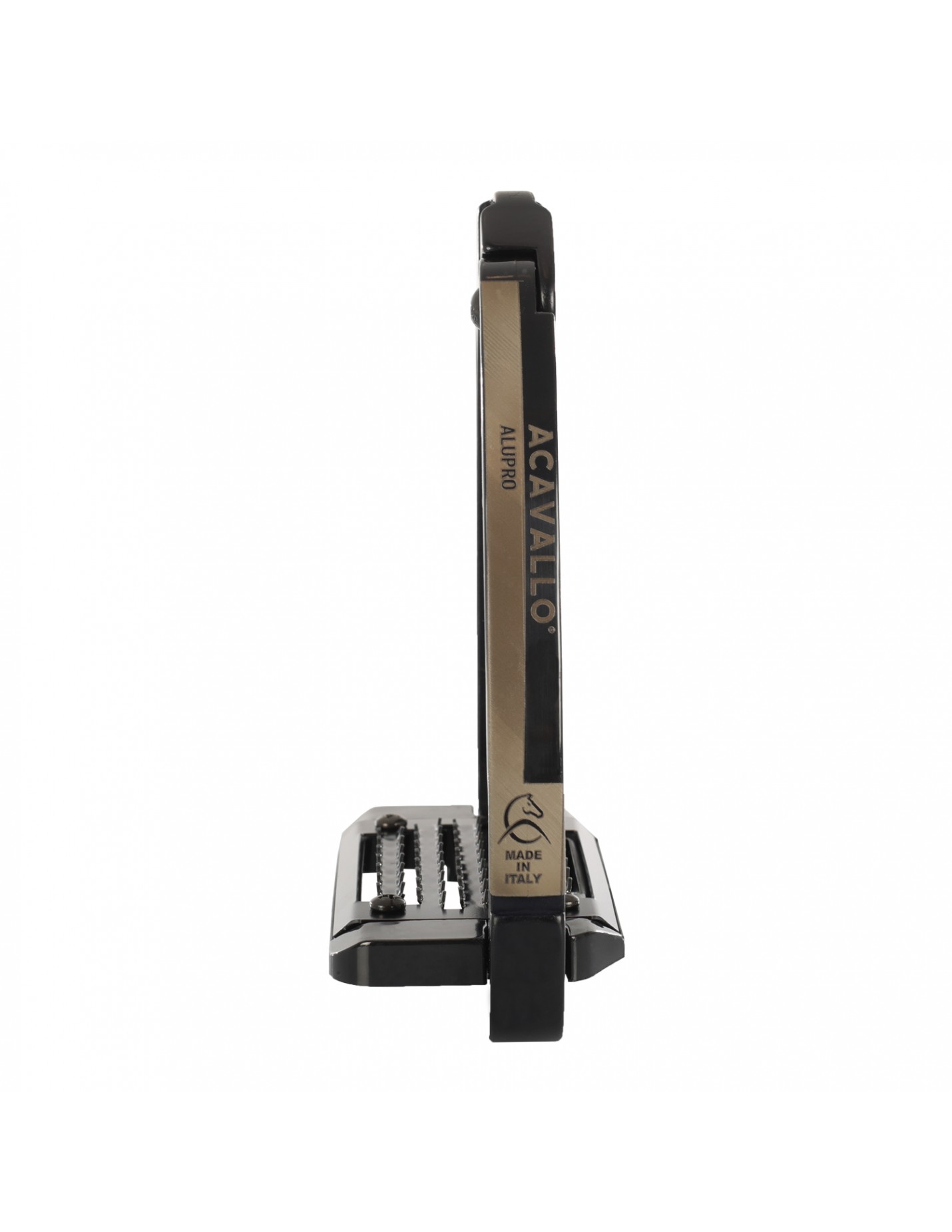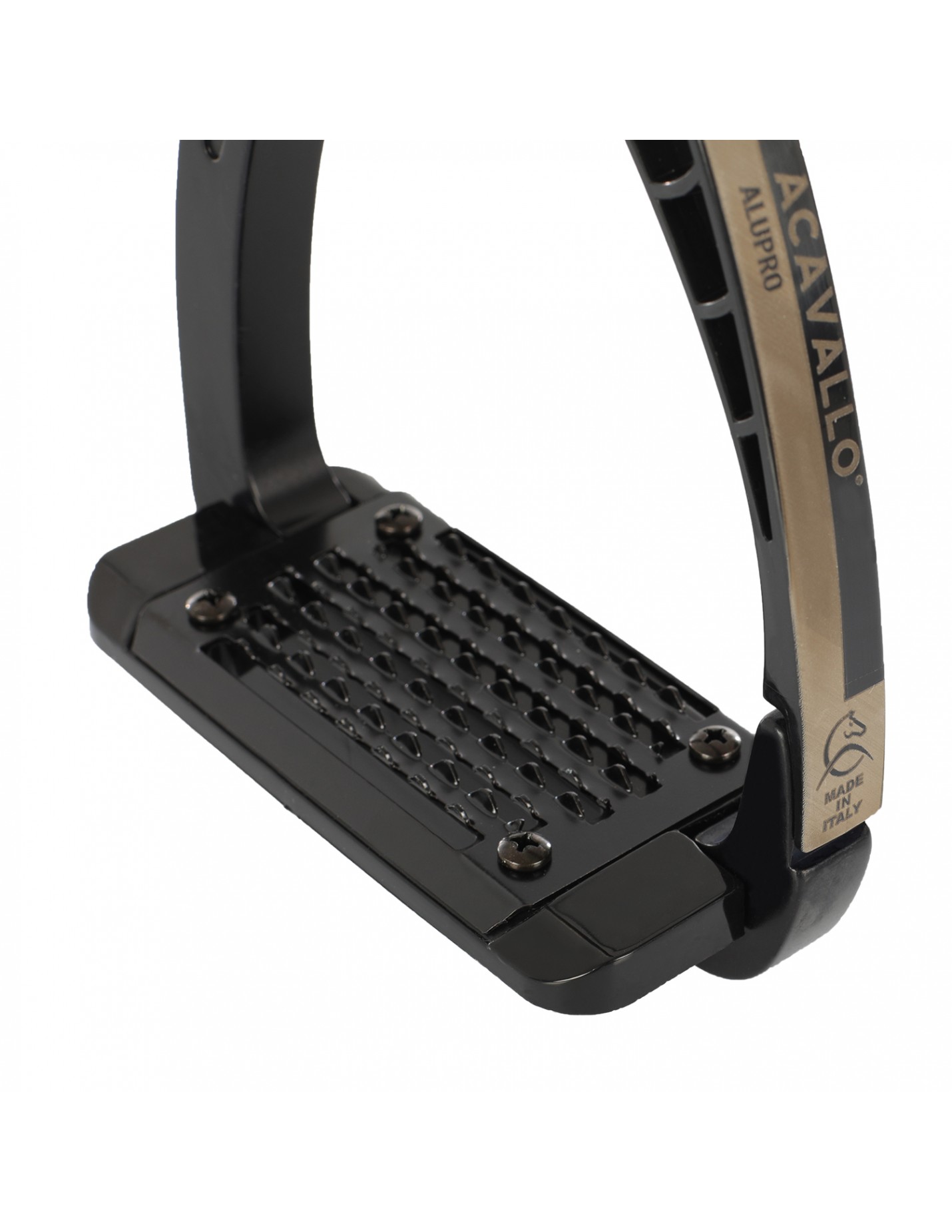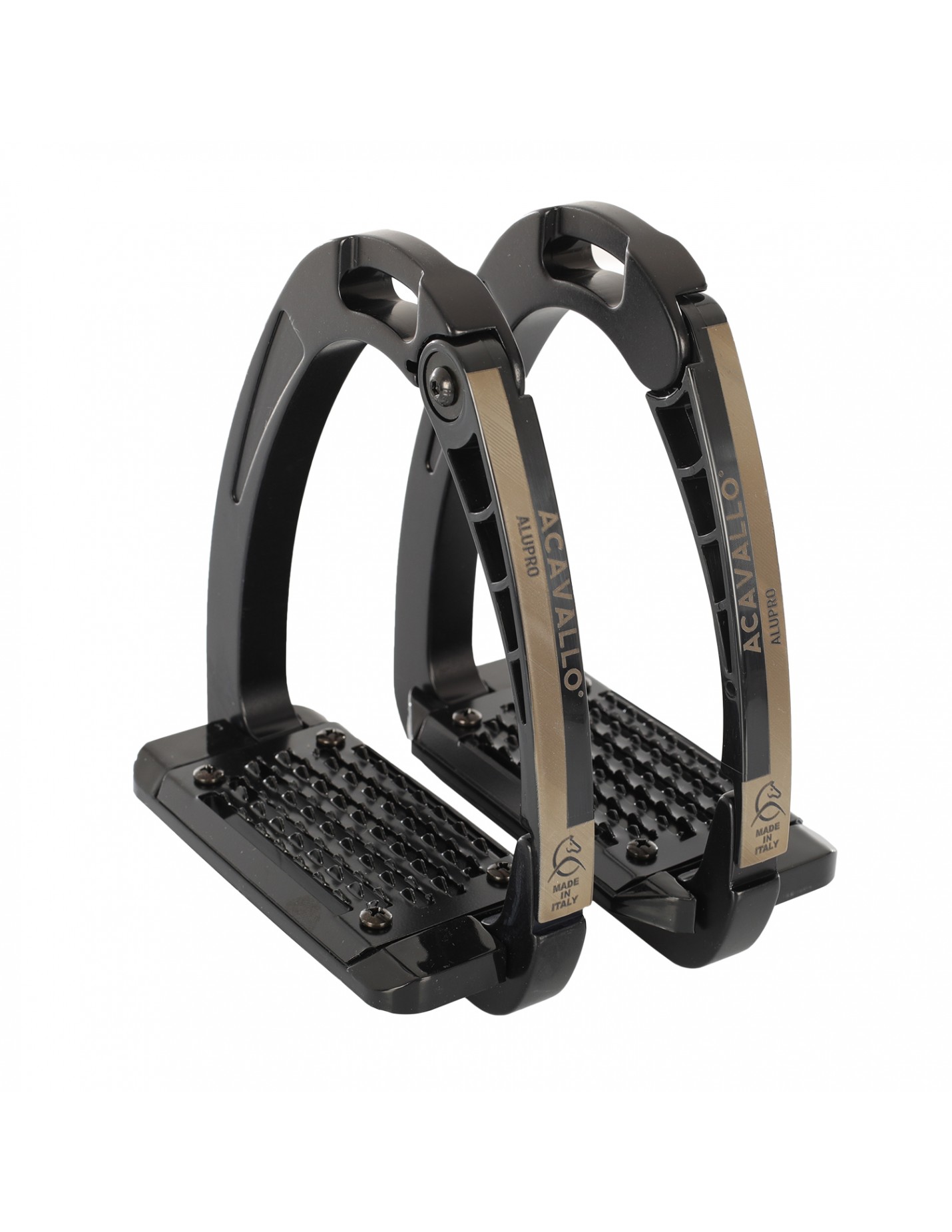 Estribo de seguridad patentado por la marca Acavallo modelo Alupro con sistema de liberación rápida del pie en caso de accidente.