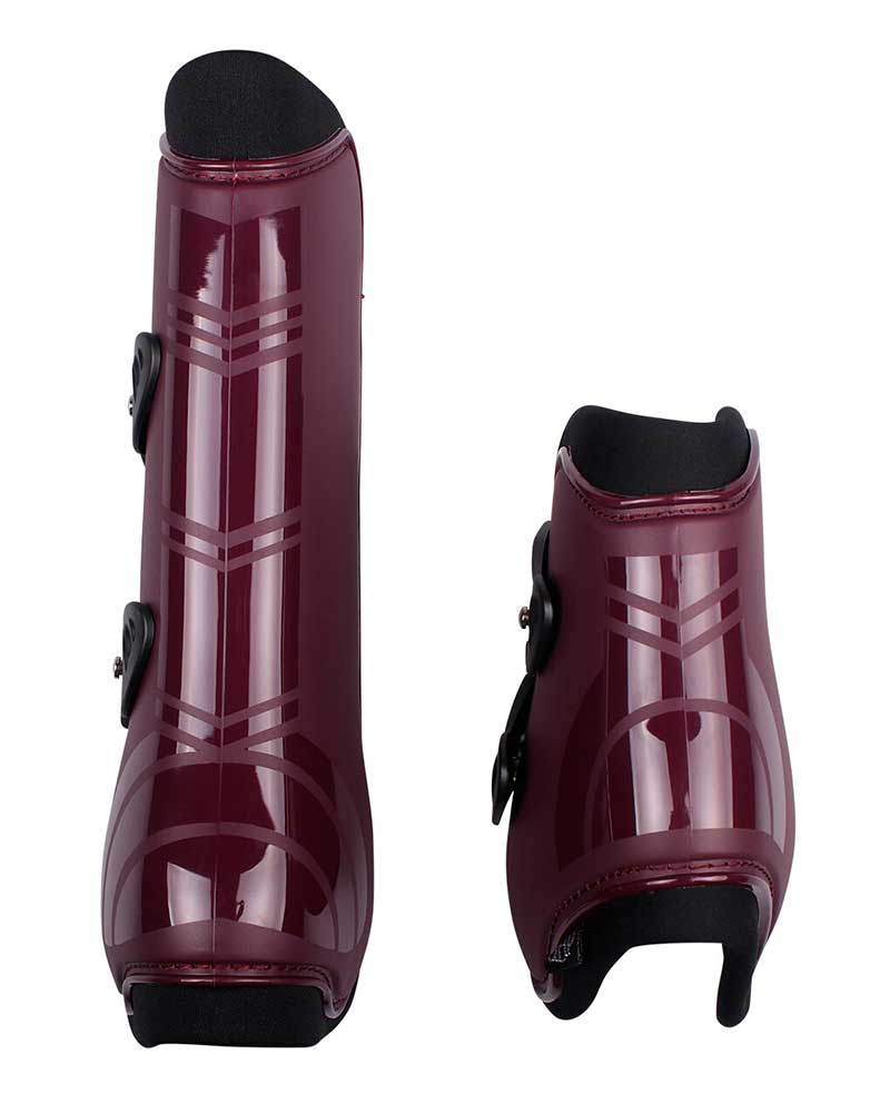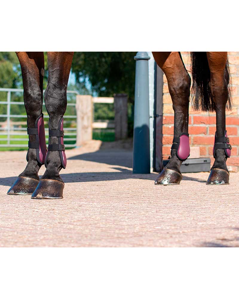Proteja los tendones y las patas traseras de su caballo de los golpes con estos protectores deportivos para tendones. Los protectores están hechos de una carcasa de plástico duro con un forro de neopreno. Se pueden sujetar fácilmente con cierres rápidos elásticos.