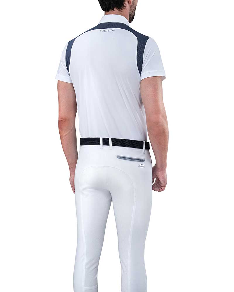 Polo de competición de manga corta para hombre. Es de tejido técnico blanco muy fino acompañado de malla azul grisáceo en axilas y hombros. Ambos tejidos son muy cómodos y transpirables, perfectos para los concursos de verano. Lleva el logo en el pecho en color a juego con la malla y bajo la botonera un pasador para la corbata.